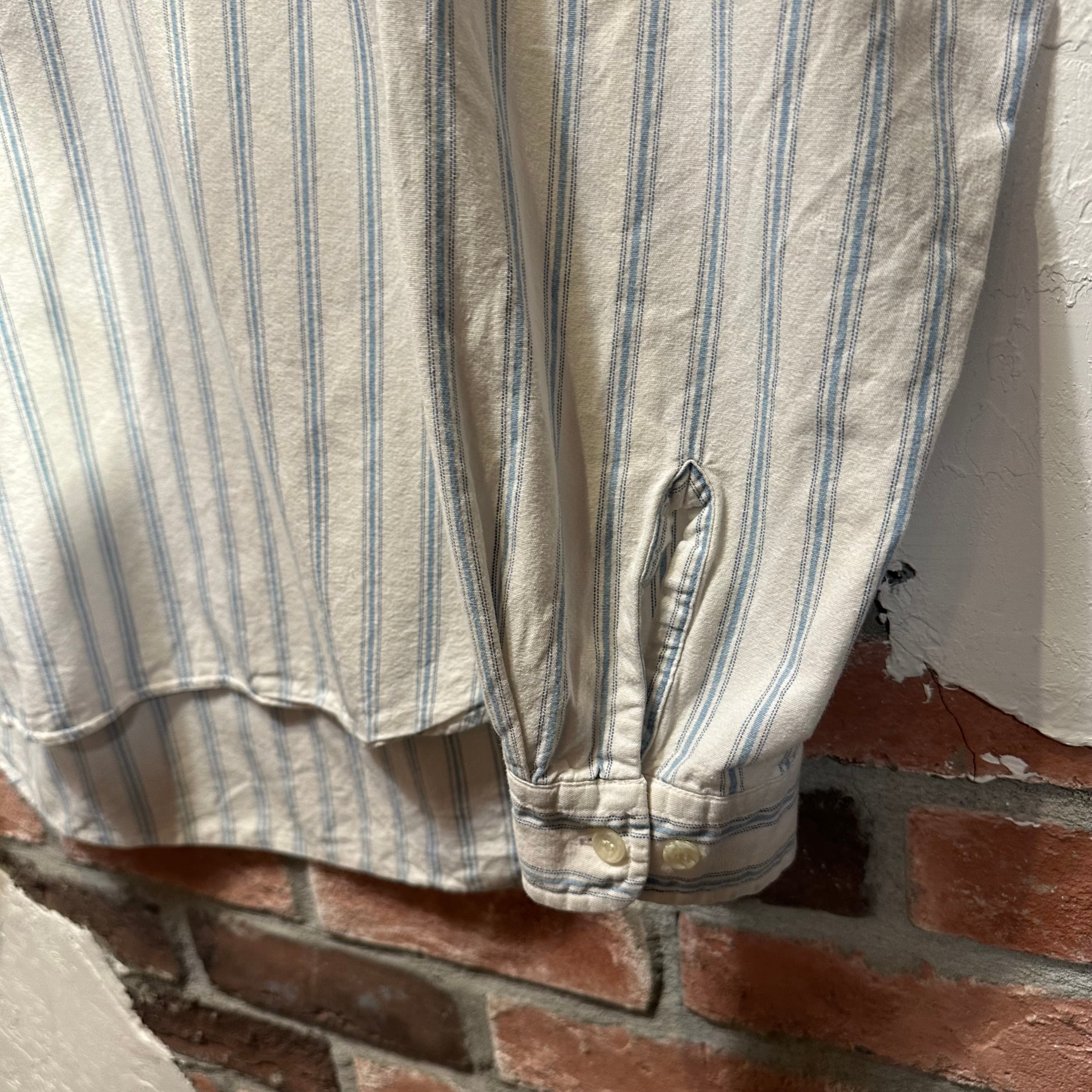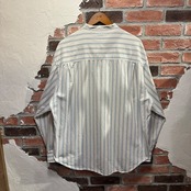白ベースにブルーの細ストライプは清潔感があり、身幅にゆとりのあるシルエットでラフに着用可能。