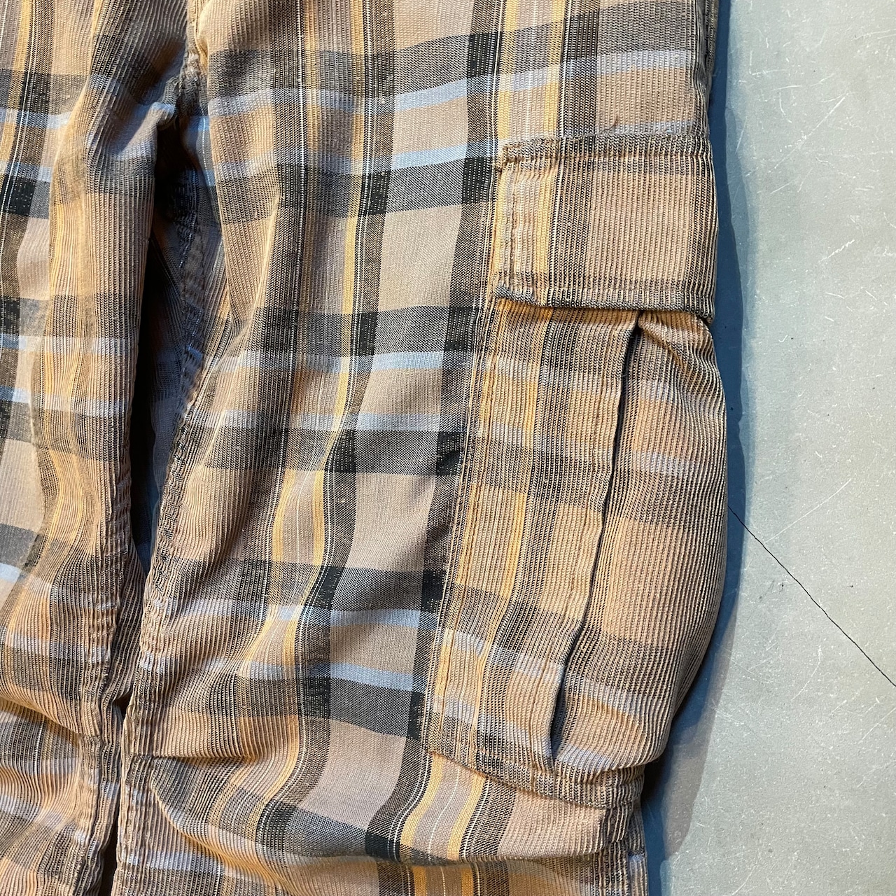 コーデュロイ生地にチェックパターンというクレイジー仕様。