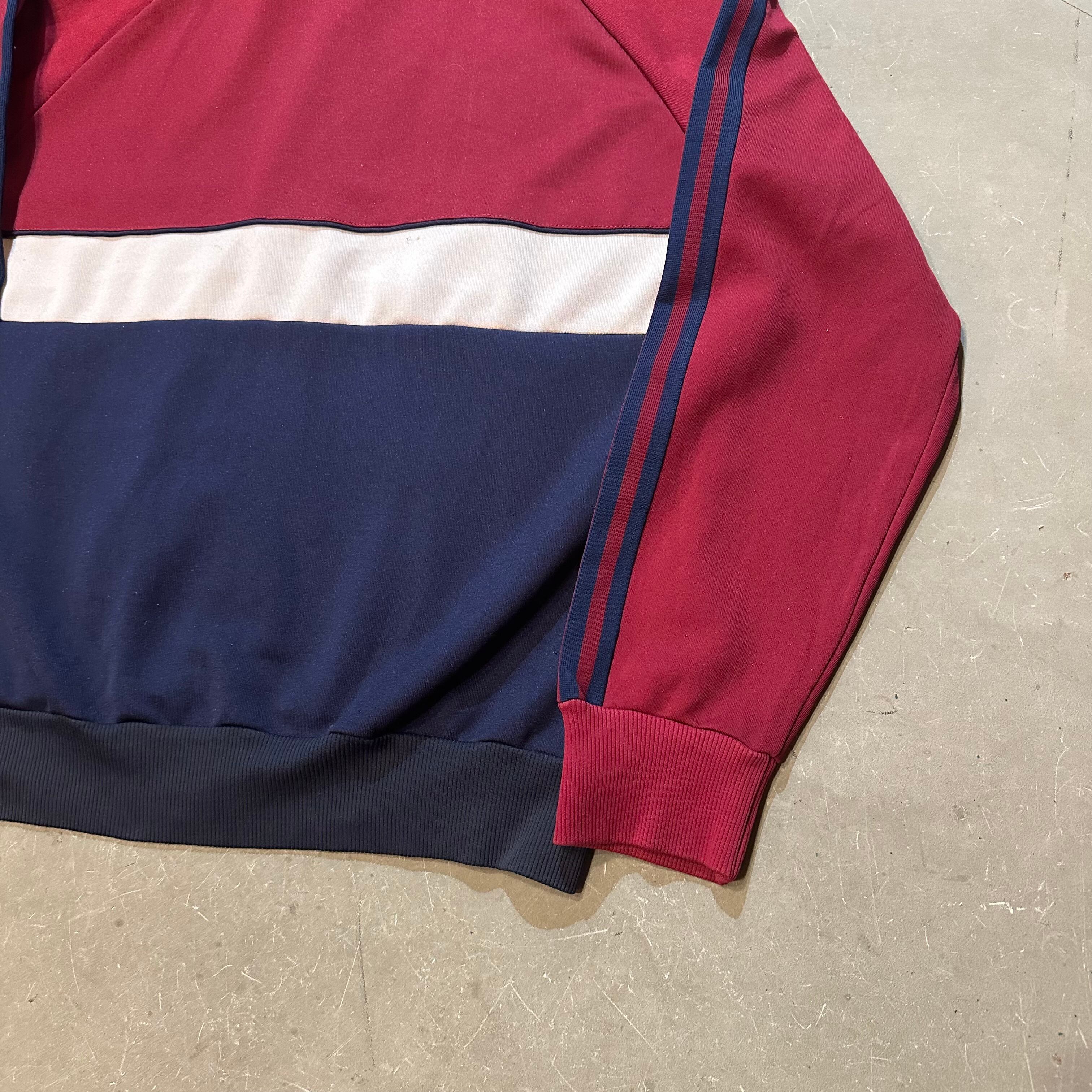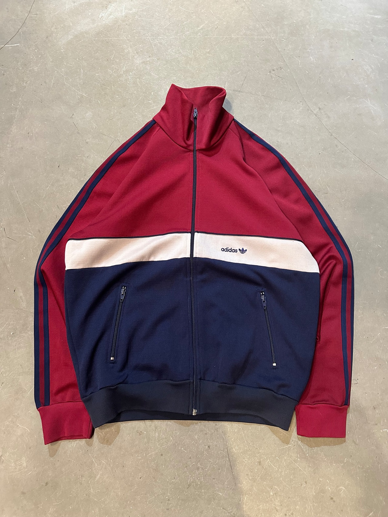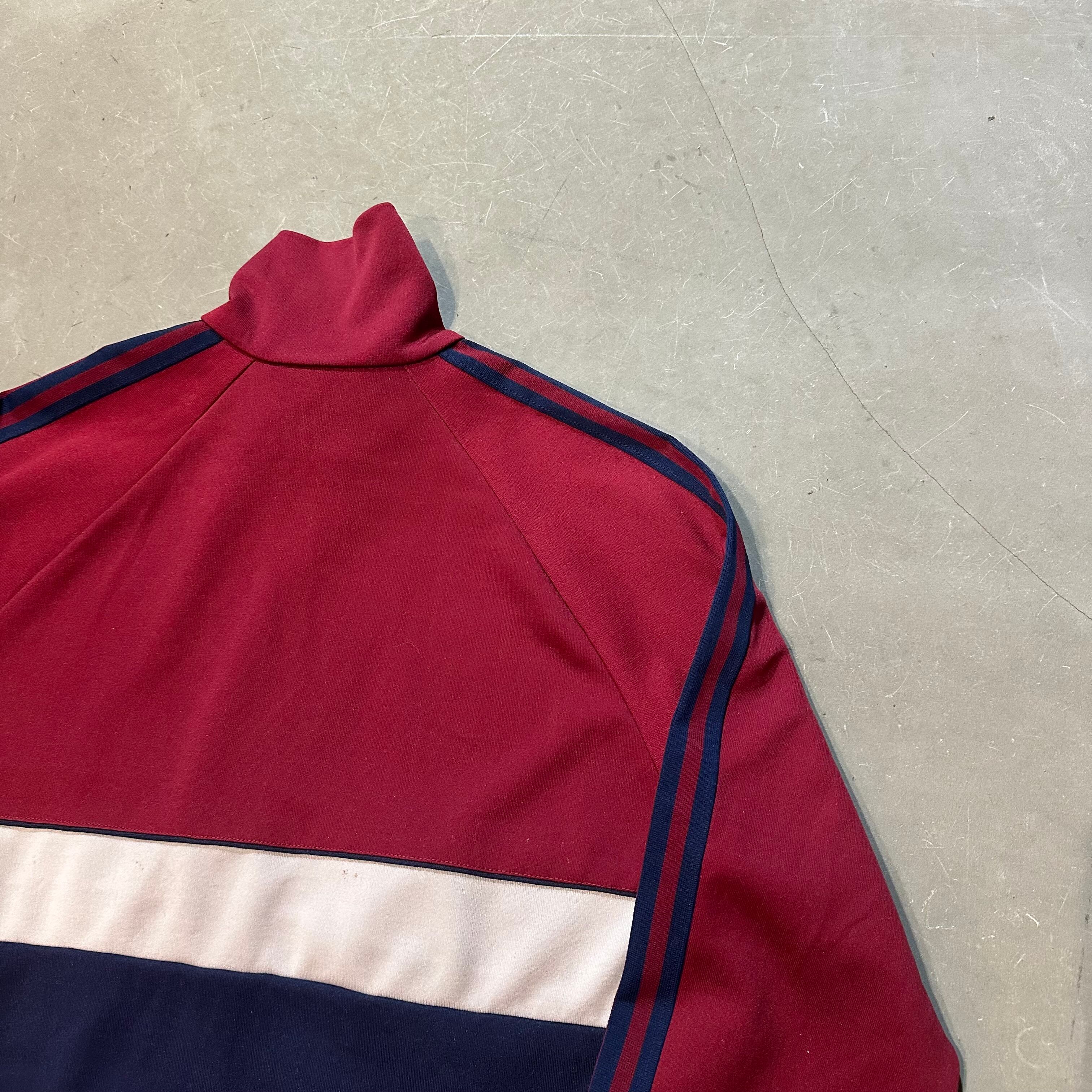 カラーはエンジ、ネイビー、ホワイトを基調とし胸元adidasとトレイフォルマークつく1着。