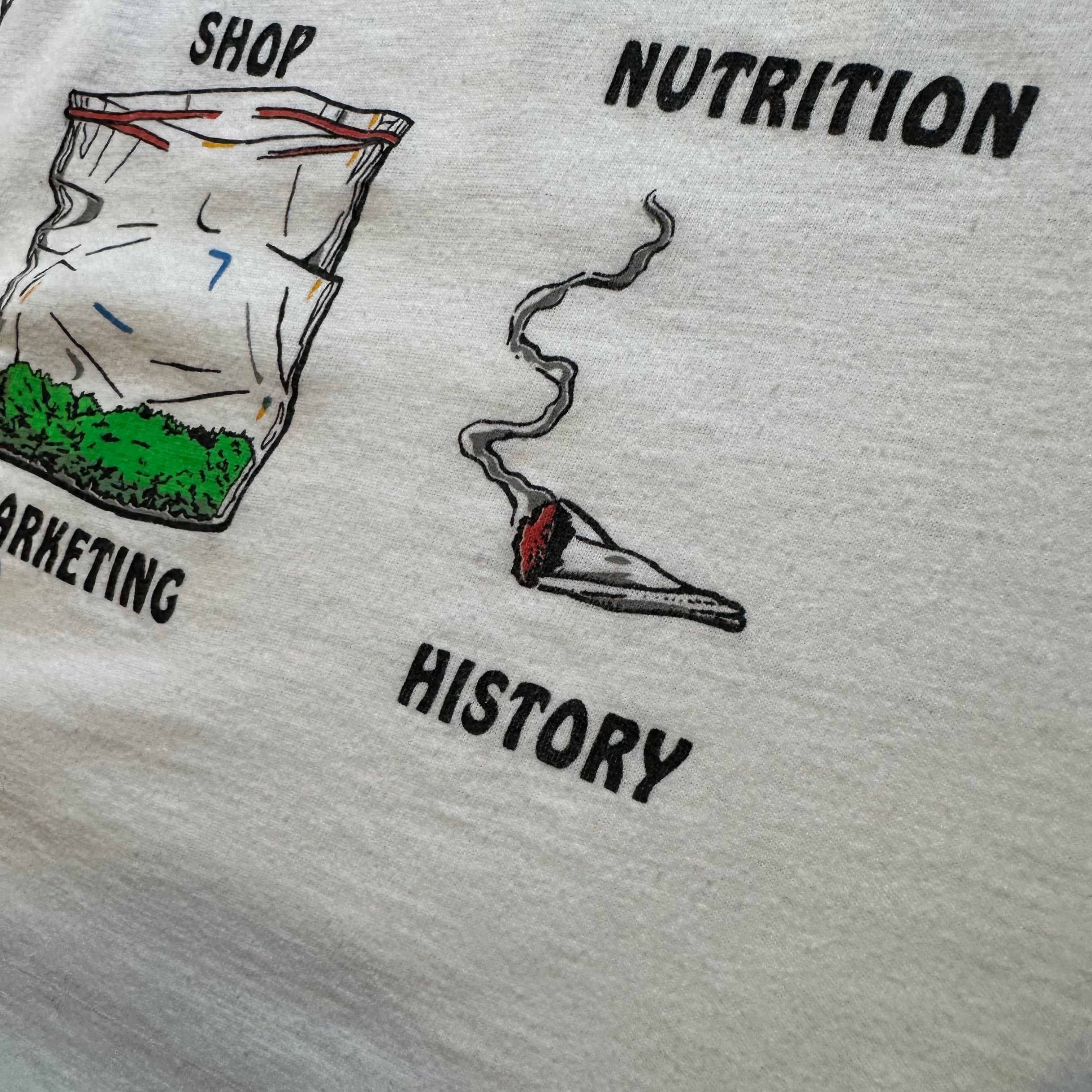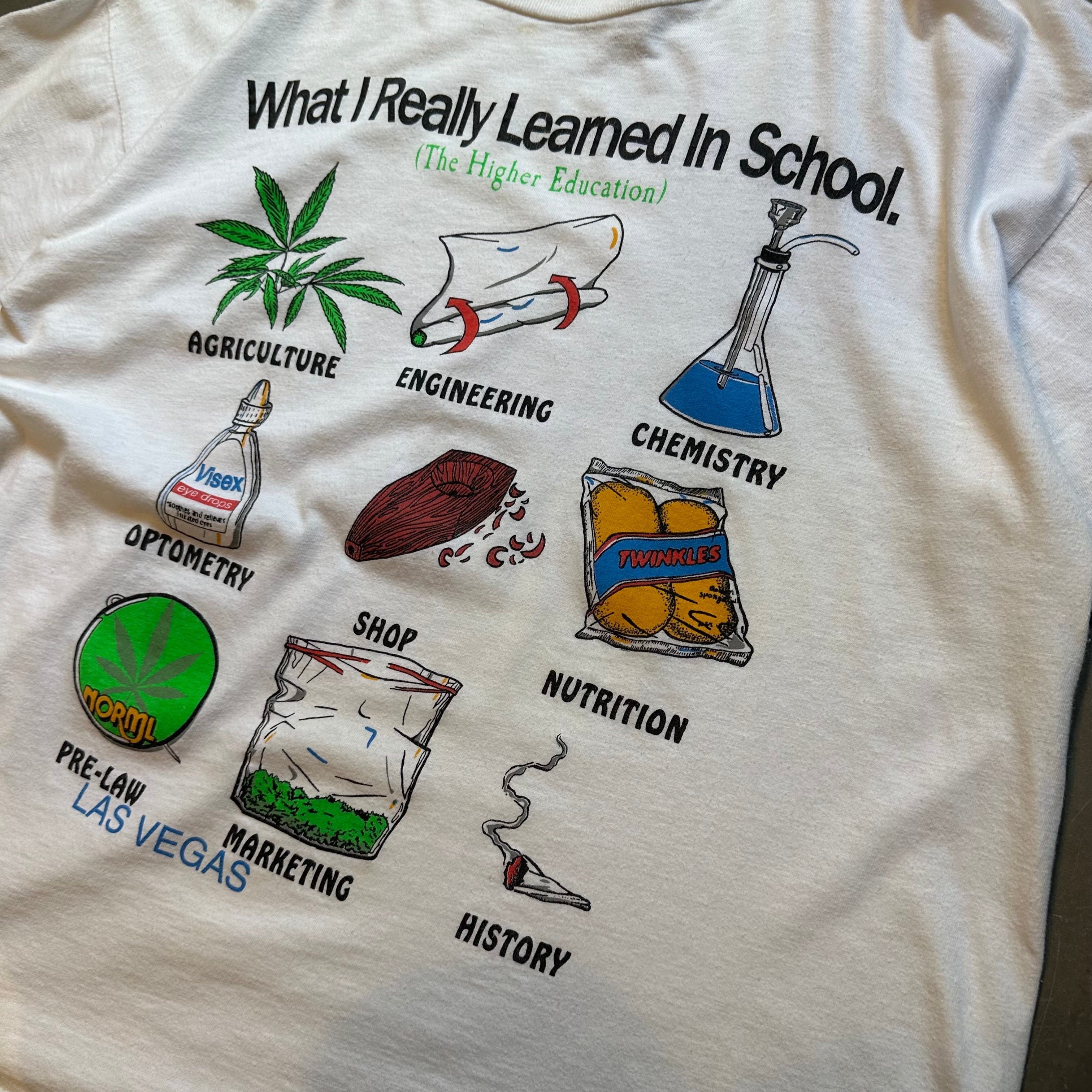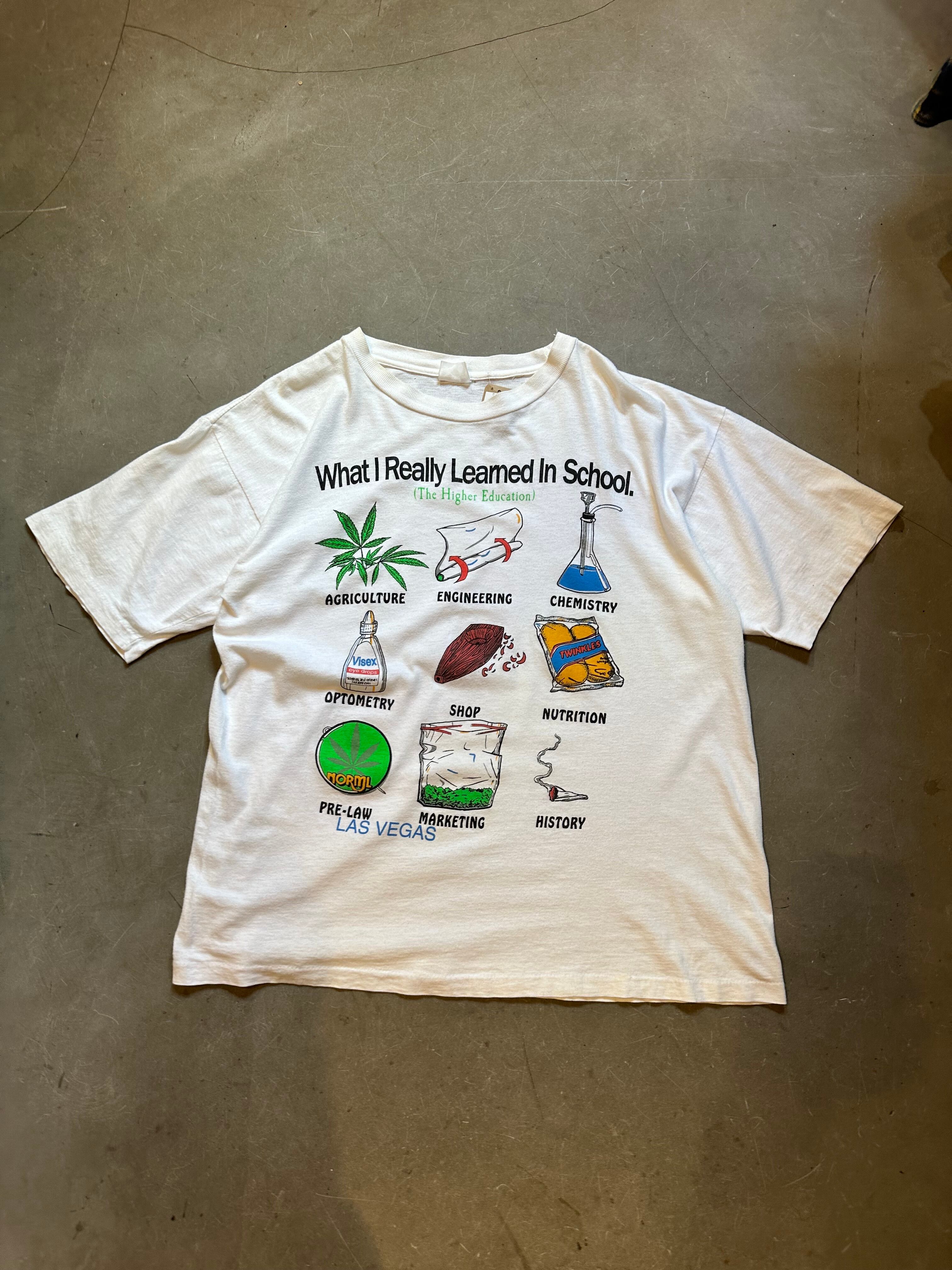 "学校で本当に学んだこと"とプリントされた、各科目科学や農業分野で大麻関連のデザインがプリントされたジョークが効いた一枚。